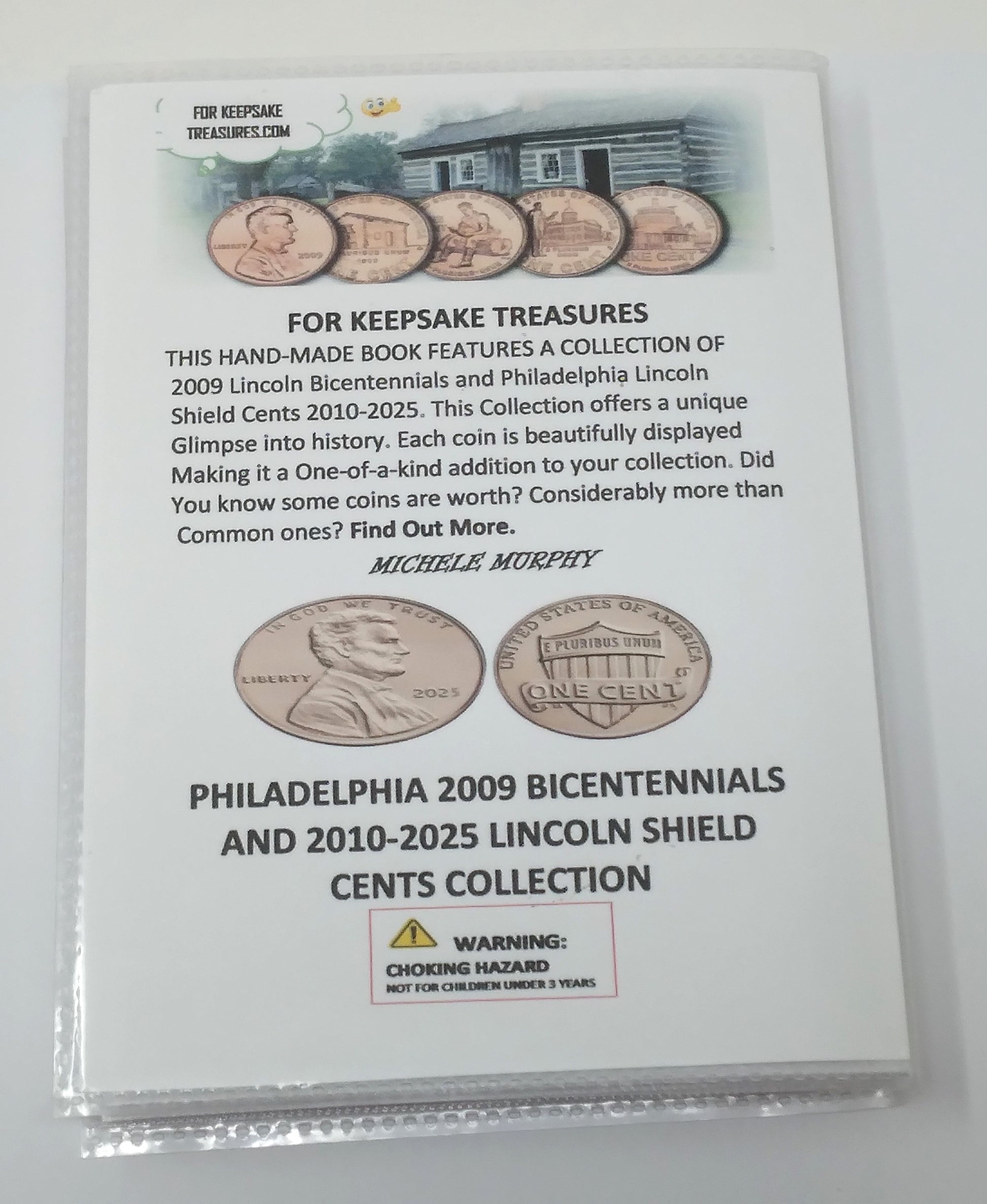 Features: Plastic-Covered Book with pennies insert years 2009 Bicentennial, and 2010 -2025 Shield, with a Matching Cotton Holding Bag.